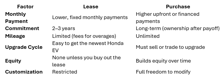 Here’s a quick breakdown of how leasing and buying a Honda EV compare: