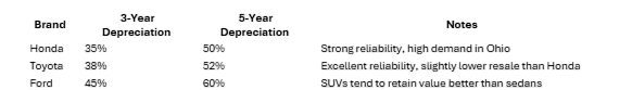 Market Demand: Popular trims, colors, and features often retain value better. For example, AWD models in Ohio are more in demand during the winter months.